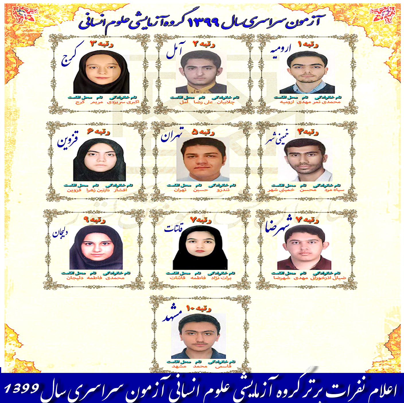 اعلام نفرات برتر گروه آزمايشي علوم انسانی آزمون سراسری سال 1399