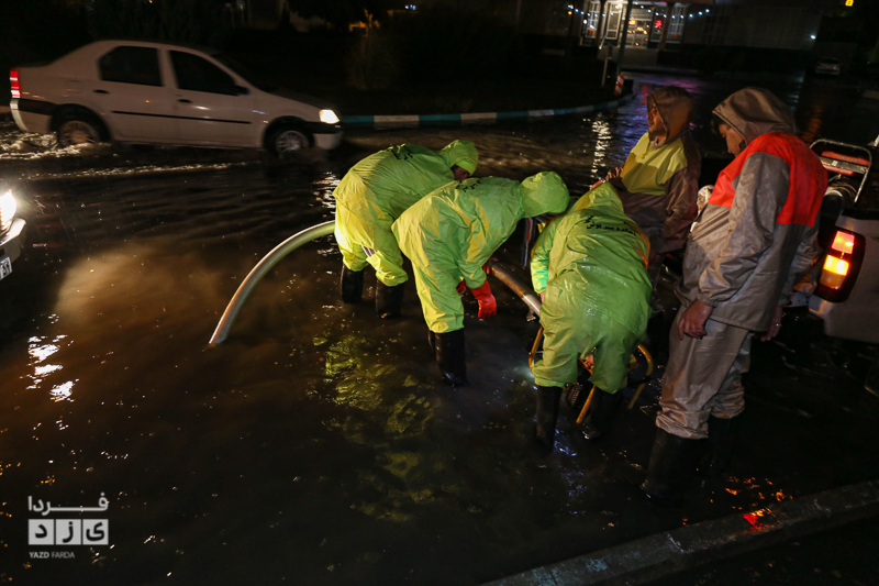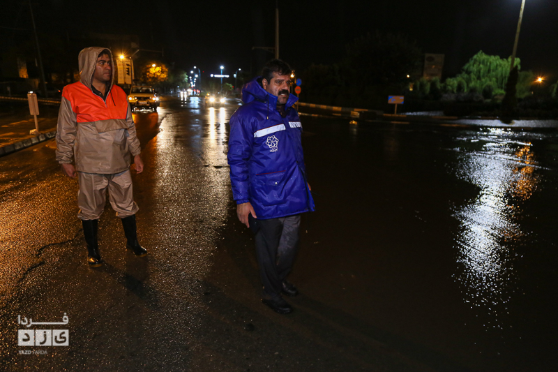 یزدفردا/ حضور شبانه حمید رضا رحیمدل سرپرست معاونت خدمات و محیط زیست شهری به همراه حامد سلطانی سرپرست مدیریت ارتباطات و امور بین الملل و همچنین نیروی های خدماتی جهت بررسی وضعیت و رفع معظل وران آب ها و بازدید از کانال های هدایت آب و دستور پاکسازی دریچه چاهای جذبی سطح شهر یزد.